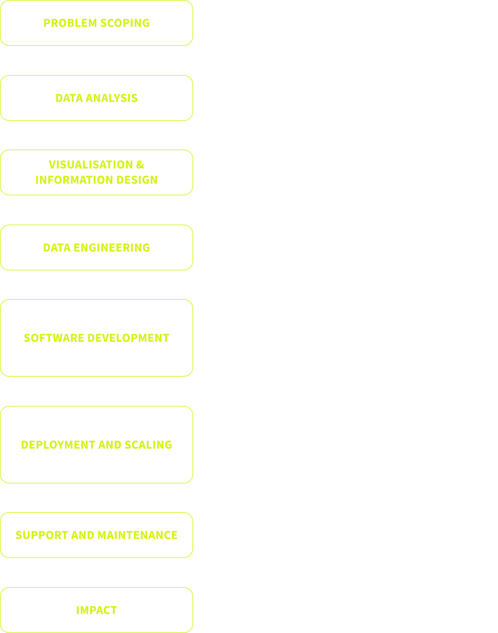 No one should have to settle for this. That's why our multidisciplinary team blends deep expertise across every step of the full-stack journey. This allows us to unite people, process, and technology, while optimising our software development and data science lifecycle through gold standard practices across research, technology and engineering.