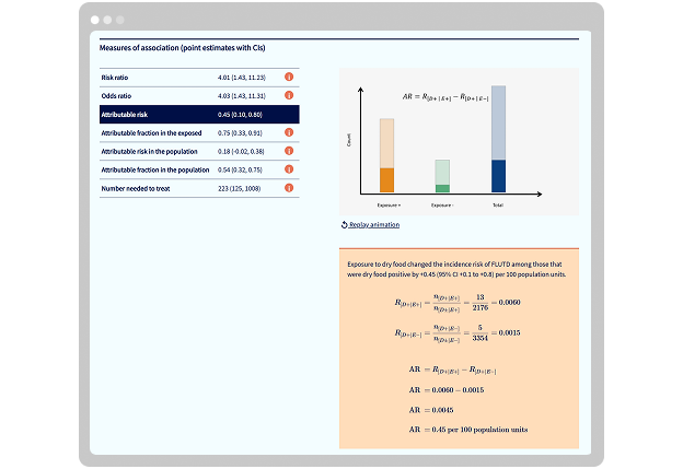 With the 2x2 calculator the project team didn’t just want to replicate what has always been done, but had the vision to take the teaching of epidemiological methods to the next level. Hence, while we provide an easy to use online calculator for the different measures of association, we also allow users to interactively explore how each measure is calculated through explanatory animations and annotations. This helps users improve how they apply and interpret the different measures and provides them with constant opportunities to refresh their knowledge while they make use of the free online tool.