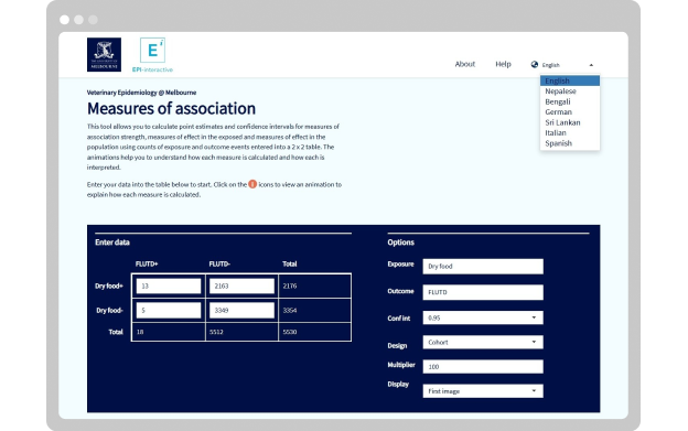 To keep this tool accessible to a wide audience, we created multiple language options. Any language can be added to the app; and users can easily switch between them through a drop-down menu. By facilitating teaching of key epidemiological concepts across language barriers the app is able to support epidemiologists working globally to improve health outcomes in humans and animals and to reduce the risk of future pandemics through regional or in-country training and capability building initiatives.