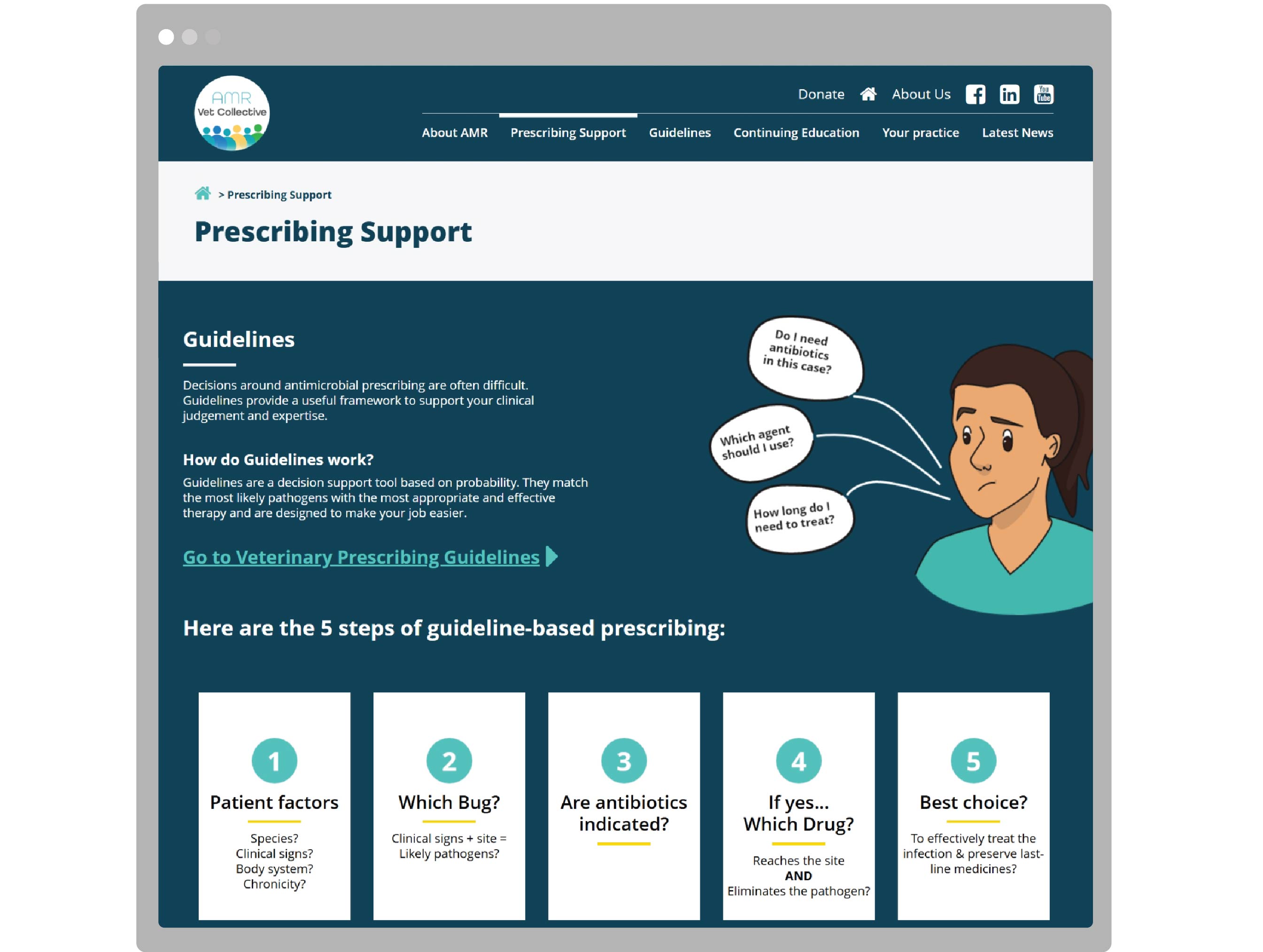 The goal of the AMR Vet Collective is to translate the science around antimicrobial resistance and stewardship for practicing veterinarians. Applying stewardship principles in veterinary practice with confidence is not an easy feat, so we helped the researchers leading the initiative create a knowledge hub loaded with curated AMR resources, including dedicated infographics, animations and online learning modules.