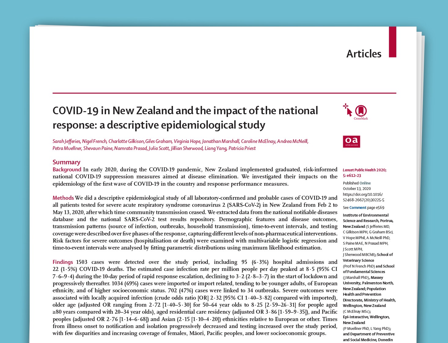 Jefferies S, French N, Gilkison C, Graham G, Hope V, Marshall J, McElnay C, McNeill A, Muellner P, Paine S, Prasad N, Scott J, Sherwood J, Yang L, Priest P. COVID-19 in New Zealand and the impact of the national response: a descriptive epidemiological study. Lancet Public Health, doi: 10.1016/S2468-2667(20)30225-5, 2020. Available here.