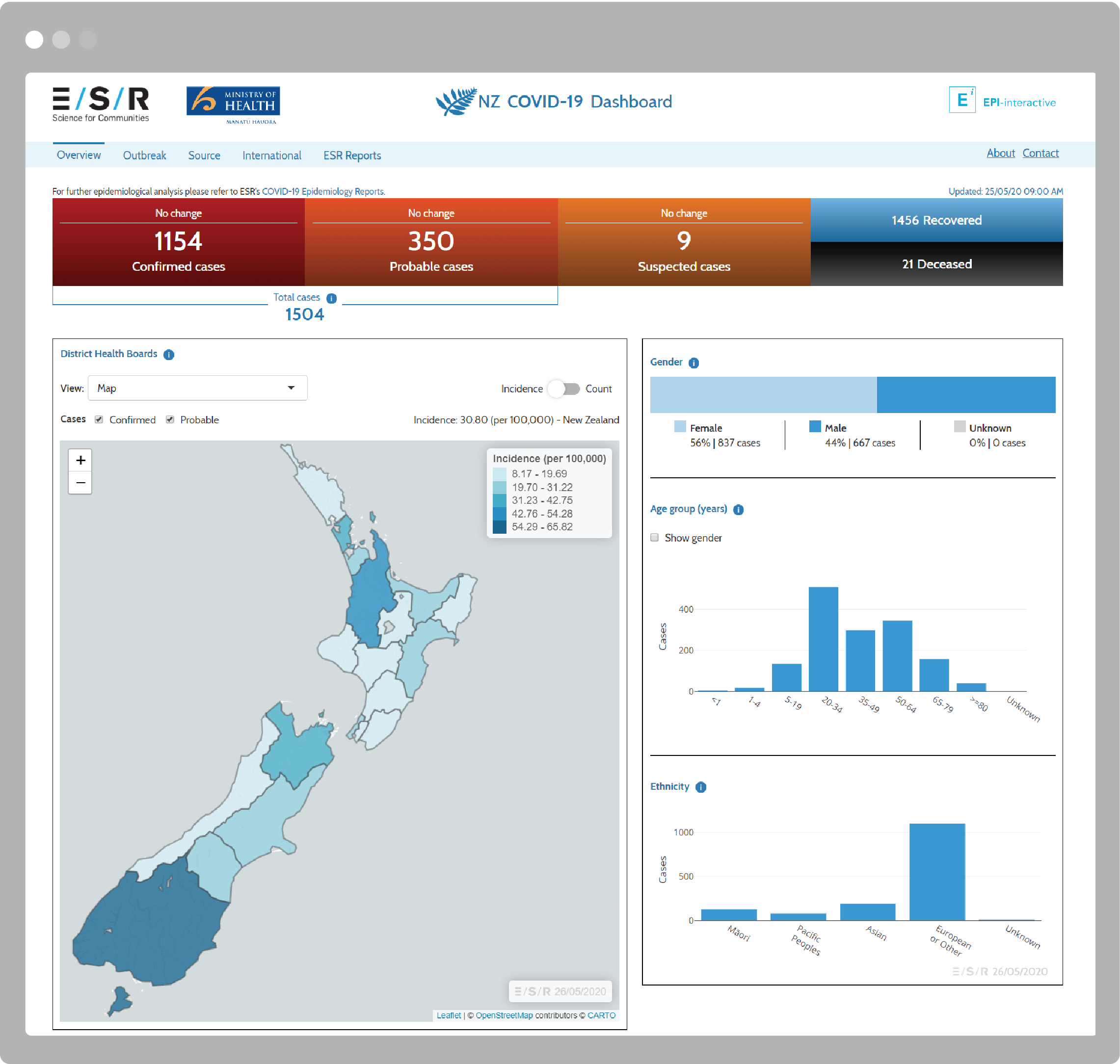 Timely information on disease cases is a critical element of any public health response, including New Zealand’s response to COVID-19. Together with ESR (now PHF science) we built intelligence dashboards for both the general public and health professionals to support the national control effort.