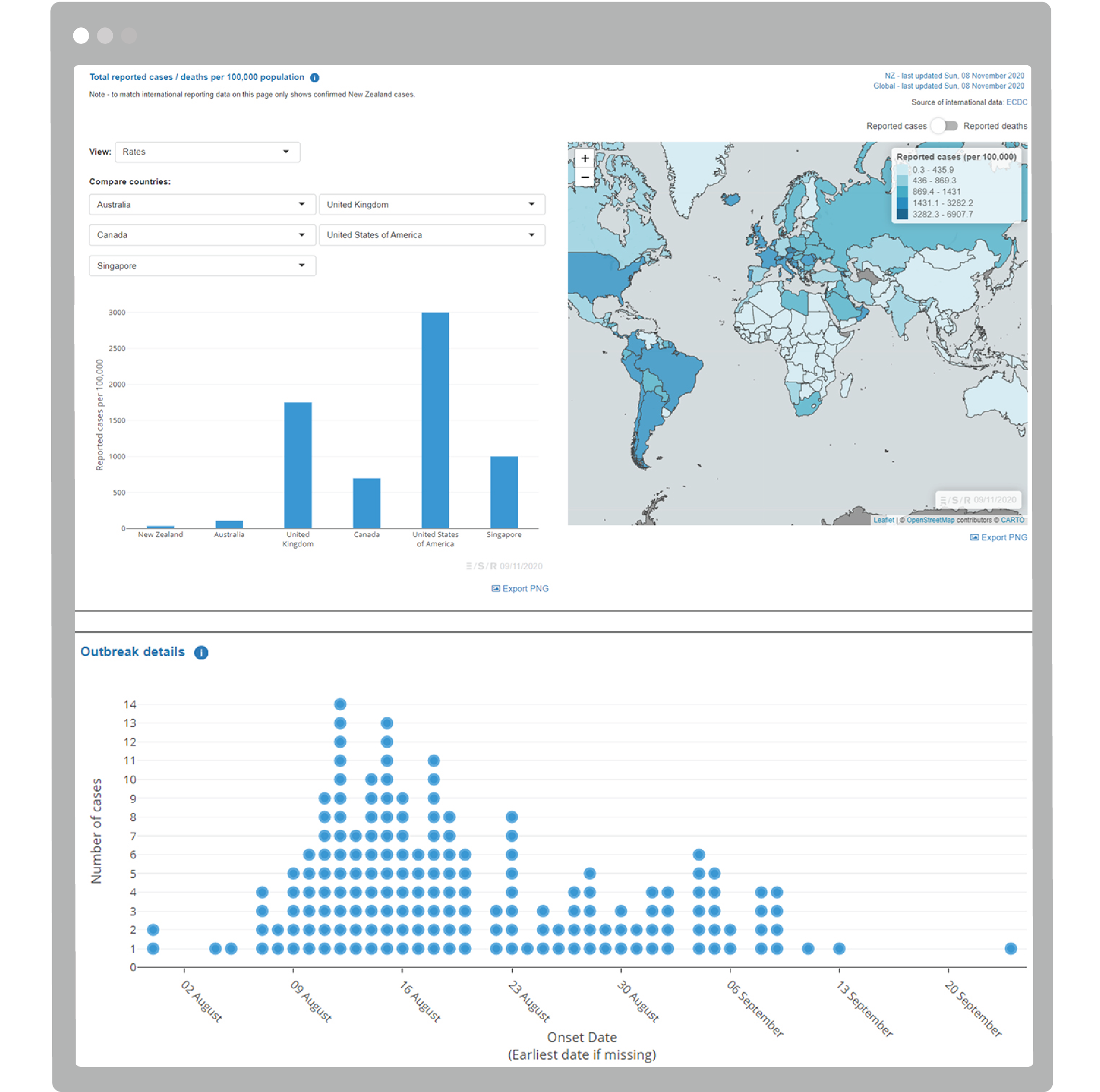 We also extended functionalities of the public dashboard to provide insight into different local outbreaks and allow comparison of the New Zealand situation with other countries. The latter required us to link into international datasets.