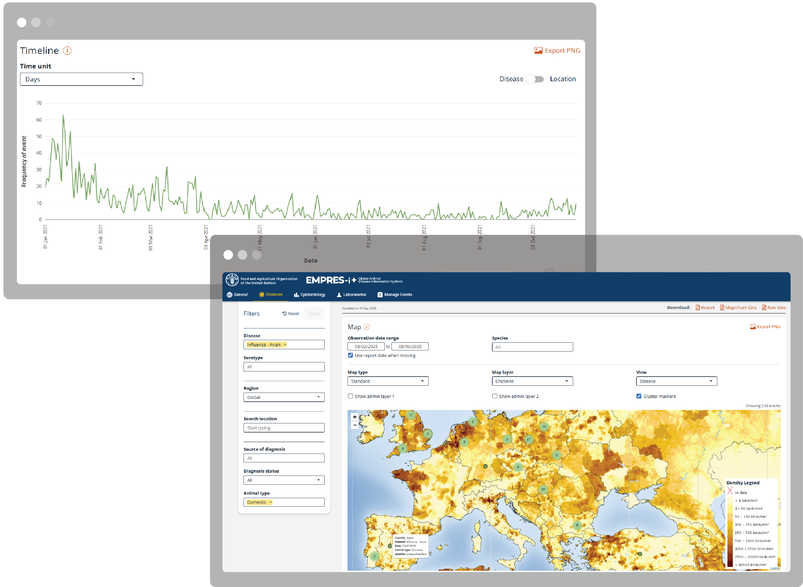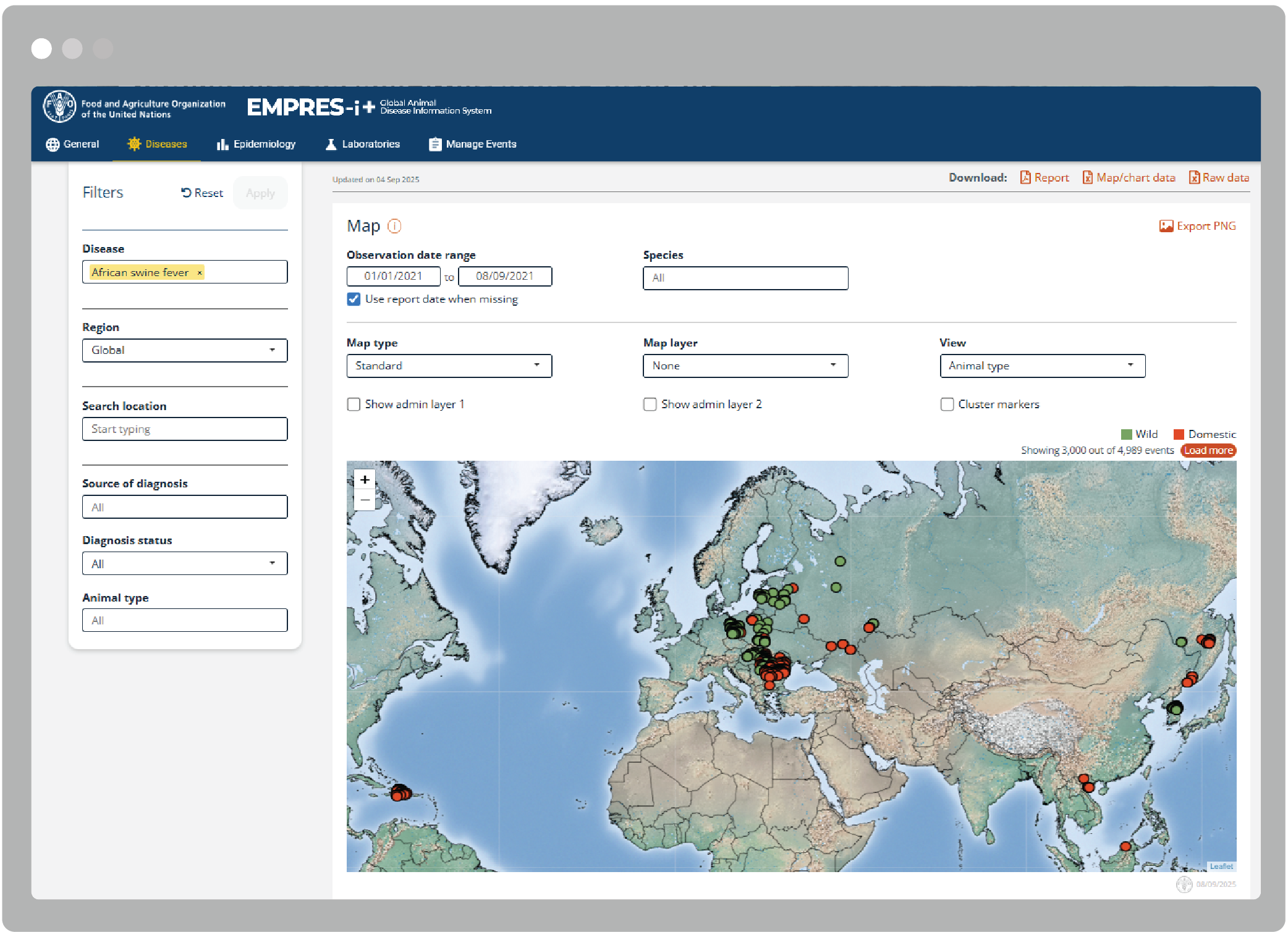 The new EMPRES-i + makes it easier for stakeholders to self-service information from the platform. Available formats include customised PDF reports, data in CSV format and PNG images of all data visualisations. This gives the user the option to export their findings in the format that they find the most useful.