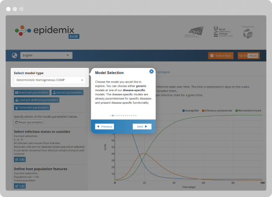 In designing Epidemix attention was paid to the wide range of users who would be interacting with the interface – from students to researchers and policy makers. Through several rounds of review, we developed a user-friendly interface which makes it easy to compare the impact of different parameter settings, such as the length of the asymptomatic period or percentage of the population that is protected by a vaccine on disease spread. To better define basic and complex models and functionalities without overwhelming users, the application was split into two platforms, Base and Plus. This ensures that the dashboard interface is tailored to the needs of the user.