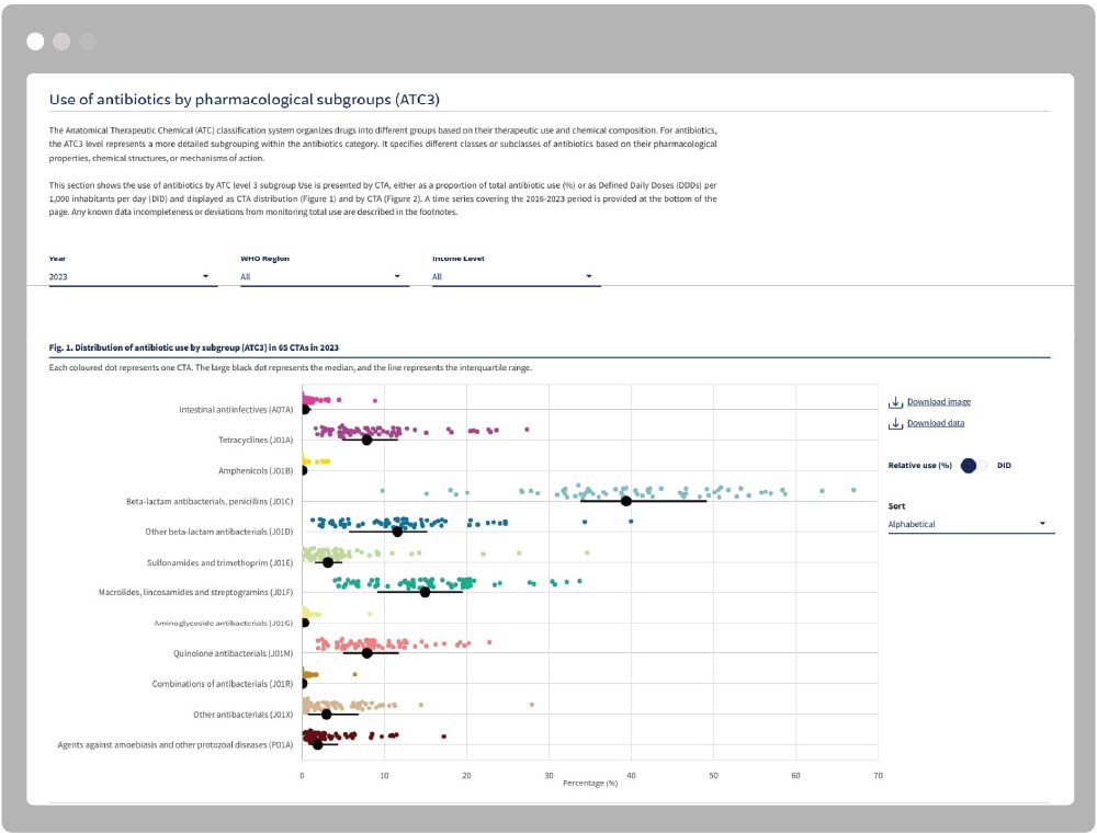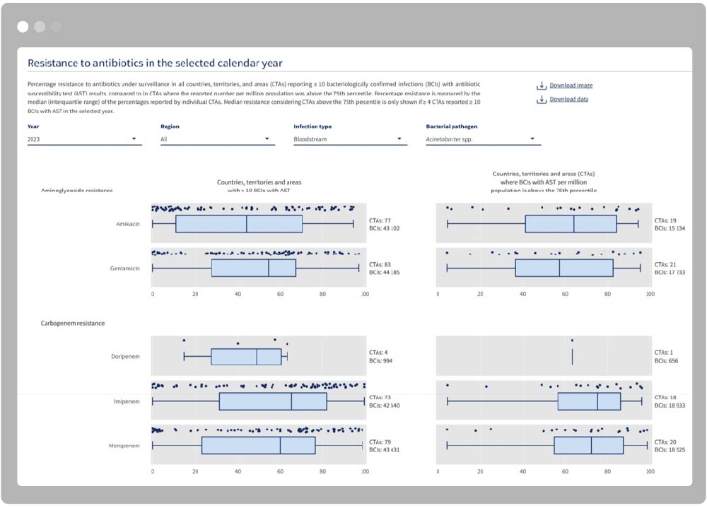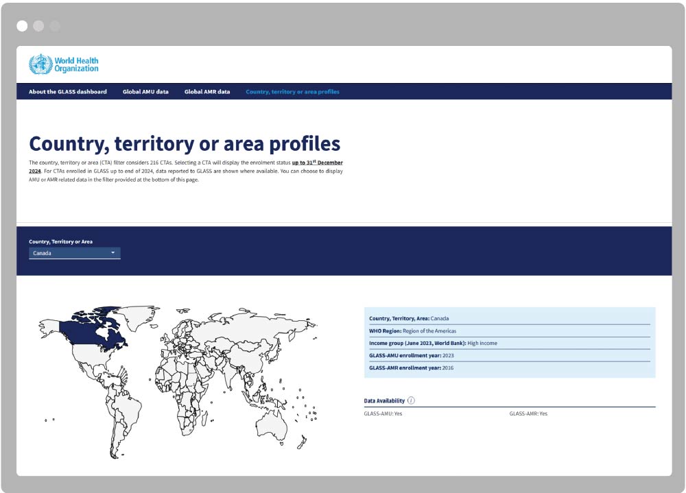The tool provides a platform for stakeholders to explore AMR and AMC data in a range of different ways – including over time or by country, bacterial pathogen or antimicrobial. Data is presented at global, regional, and national levels, including individual CTA profiles, providing direct access to the underlying data of GLASS reports and supporting transparent dissemination of data.