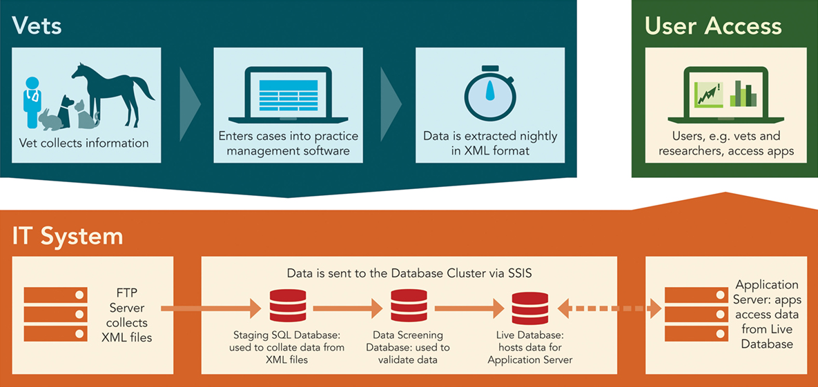 Development of a national veterinary practice-based equine health surveillance system that enables key clinical data to be collected automatically from commercial practice management software. The data is uploaded into a centralised database in near real-time through secure electronic transfer systems.