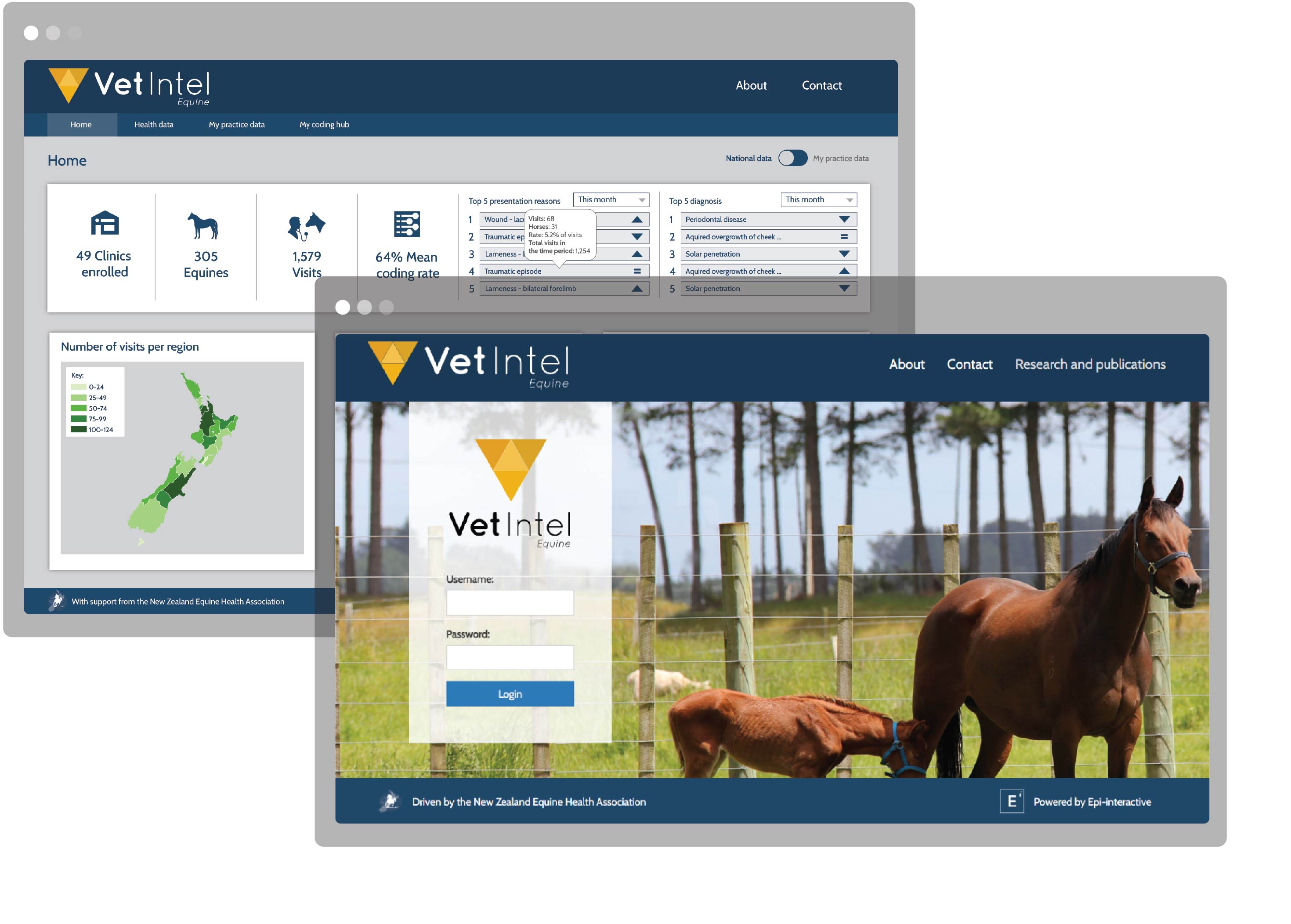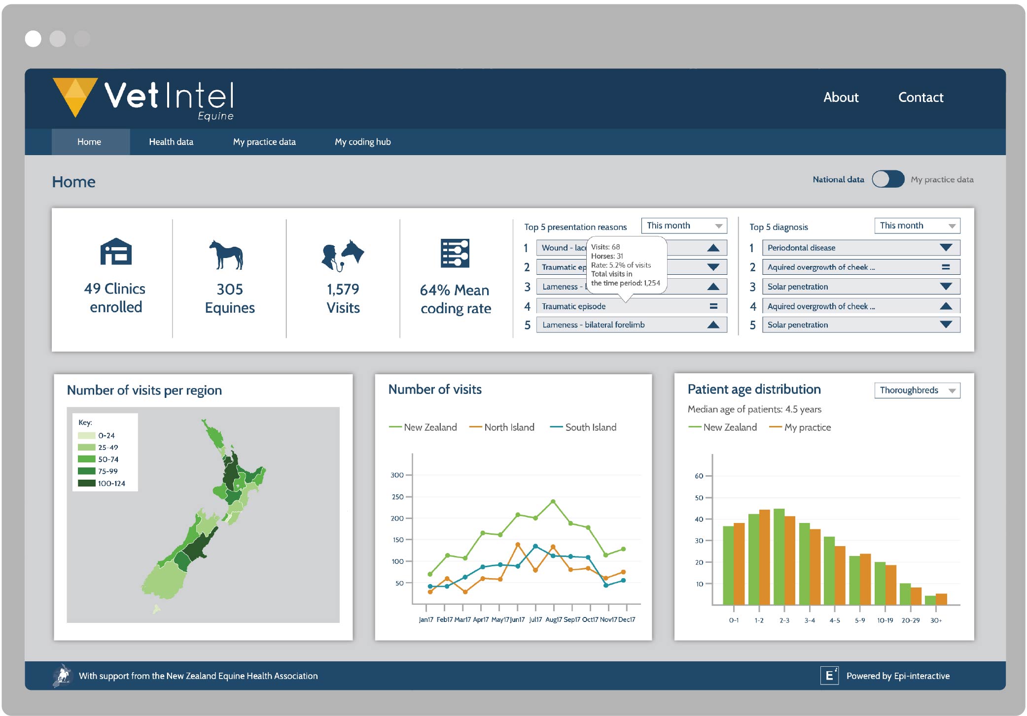 VetIntel collects equine primary care data collected from veterinary clinics across New Zealand to provide insights into population demographics, disease occurrence and welfare status of the New Zealand horse population.