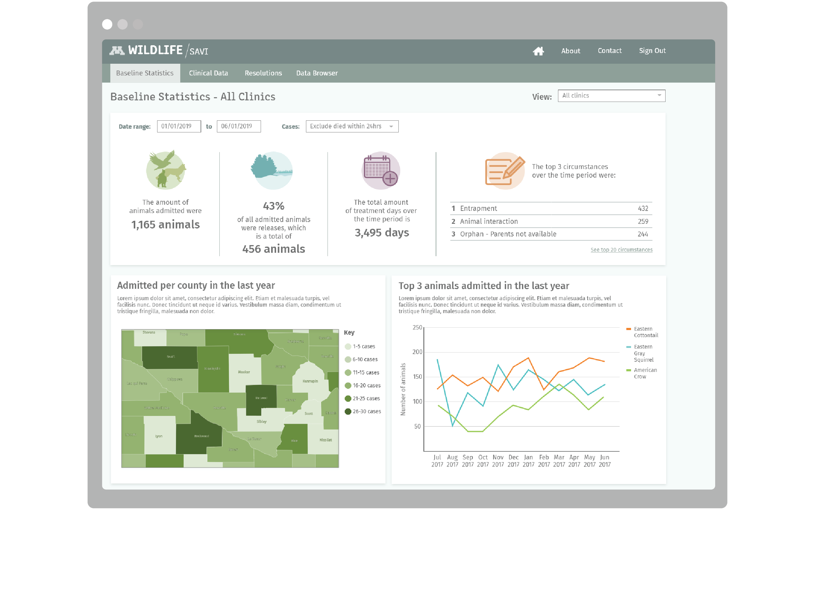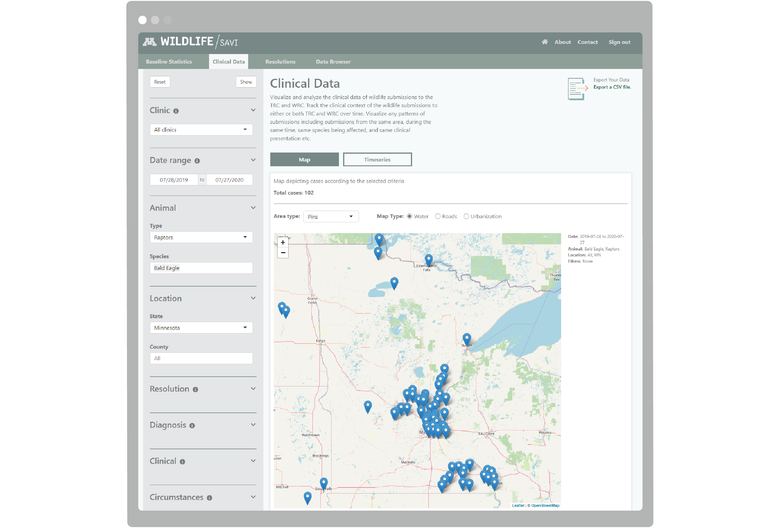 WILDLIFE/savi uses data from wildlife clinics in Minnesota to help improve our understanding of wildlife health and factors contributing to conservation status. By bringing together data from different wildlife rehabilitation centers the project was able to improve the group’s ability to make evidence-based decision to improve care both at the individual animal and population level.